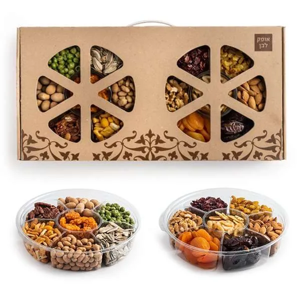 מארז השי המנצח לטו בשבט! שתי צלחות עשירות אחת בפיצוחים ואחת בפירות יבשים טריים: