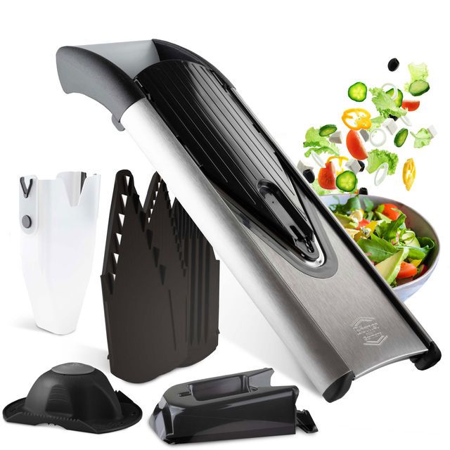 גוף המכשיר בעל דיסק שטוח המשמש לפריסת ירקות ב 4 דרגות עובי, כולל שלב 0 לנעילת הסכין לאחסנה בטוחה.