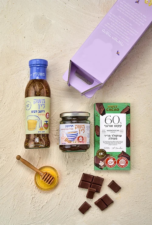 מארז מאוייר עם ידית נשיאה המכיל שוקולד מריר איכותי לצד מוצרי משק. מידות: 40/8/8 ס"מ
