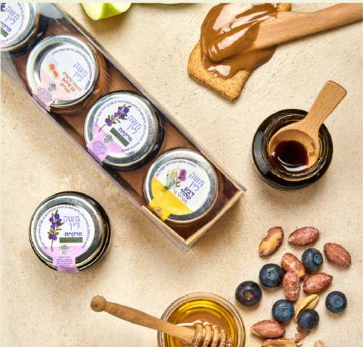 מארז מגירה עם שרוול שקוף המכיל רביעיית מעדני משק מובחרים. מתנה מלאה מתיקות למכרים ובני משפחה.