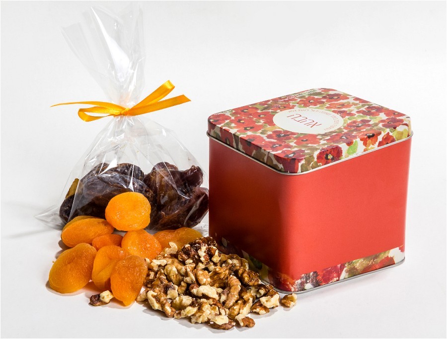 את המיקס פירות יבשים ושקדים אנו אורזים בשקיות צלופן עם סרט יפה לשמירה על אתסטיקה וטריות מירבית ואת שקיות הצלופן מכניסים לתוך מארז הפח המאוייר. מתנה נהדרת לטו בשבט לעובדים.