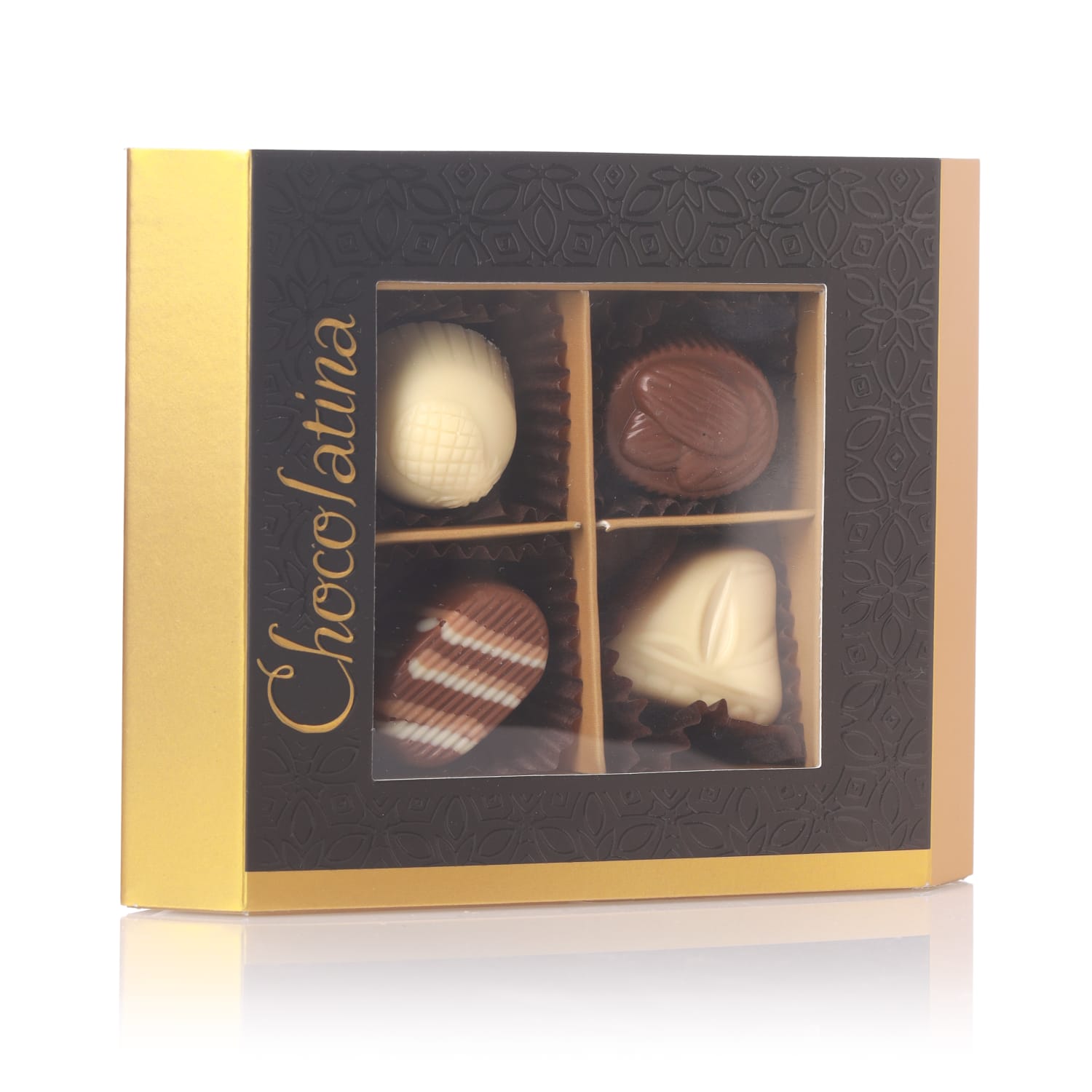 4 פרלינים במארז מפואר הפרלינים עשויים ממיטב חומרי הגלם וממולאים במגוון מילויים מפתעים במרקמים עשירים המעניקים חויה פרלינית עוצמתית